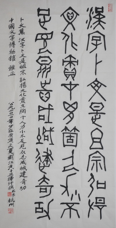 近日,著名篆刻书法家刘江先生特为中国文字博物馆开馆一周年题赠神品书作“汉字卜文是祖宗,弘扬文化责在胸。个人力小不足见,众志成城建奇功。”