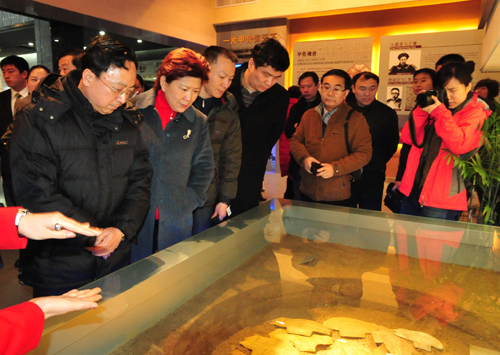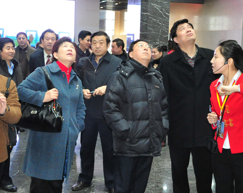 崔为工一行详细参观了中国文字发展史基本展厅,在讲解员的详细讲解下文化部对台文化工作专题会议代表对甲骨文、铭文及少数民族文字产生了浓厚的兴趣,并详细询问文字、文物的出处。参观结束后对我馆的整体设计和系统展览给予了高度评价。