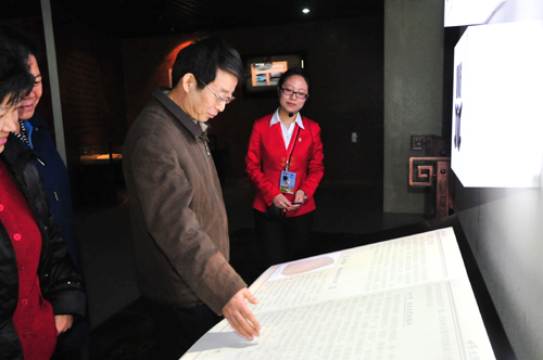 方宁一行详细参观了“一片甲骨惊天下”特别展览,中国文字发展史基本陈展,观看了4D影片《甲骨文》,在“互动与影像厅”兴致盎然的观看电子书,并对甲骨文、金文、钱币文字、印刷术产生浓厚的兴趣,详细询问陈展文物的相关背景并进行热情的讨论。方宁一行对我馆的陈展设计及讲解水平表示非常满意。