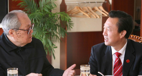 中国文字博物馆馆长冯其庸(左)和中国文字博物馆党委书记、常务副馆长冯克坚亲切交谈。