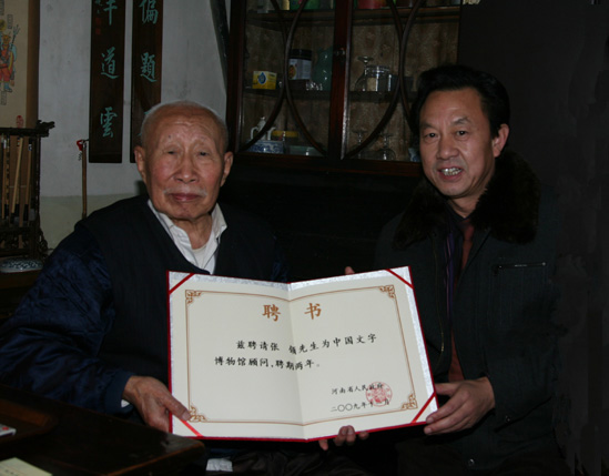 冯克坚同志为张颔先生颁发河南省人民政府聘书