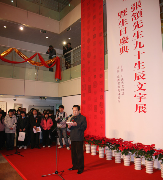 冯克坚同志转送了由冯其庸先生亲笔写给张颔先生的生日贺信,并代表冯其庸先生、代表中国文字博物馆、代表来宾在庆典仪式上致贺辞,恭贺张老“福如东海、寿比南山”,并将张老的寿辰与中国文字博物馆的开馆共庆为“文博界的喜事、幸事、盛事”!同时,向张老敬献了一副“九十曾留千载笔,十年再进百令篇”的巨幅寿字中堂。张颔老先生欣然接受河南省人民政府的聘请,并表示中国文字博物馆的开馆对于保护、传承、弘扬和发展中华民族文字文化具有极其重要的意义。他还向中国文字博物馆赠送了《侯马盟书》并题词。