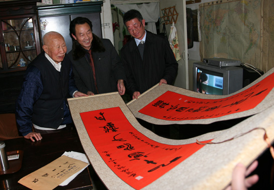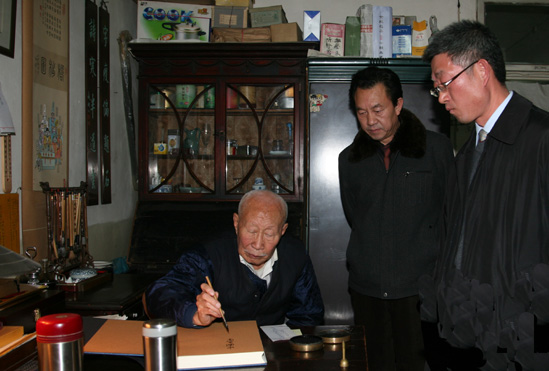 11月29日晚,受冯其庸先生委托,冯克坚同志一行来到山西大学,拜访了96岁高龄的国学大家、著名书法家姚奠中先生。在转送完冯其庸先生的亲笔信后,冯克坚同志代表中国文字博物馆,代表冯其庸先生向姚先生表示问候。他表示,冯其庸先生一直挂念姚老先生,对于姚老先生在国学、书法艺术等方面取得的成就非常仰慕,由于特殊原因不能亲自造访,再三嘱咐我们到山西代为看望。冯克坚同志还详细询问了姚老先生的身体情况,并祝老先生健康长寿。
