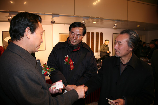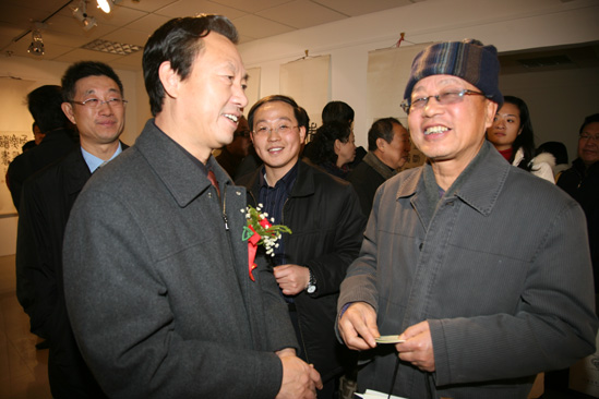 冯克坚同志与山西大学博士生导师、著名书画家李德仁(中),山西省书法家协会副主席、太原师范学院教授刘锁祥(右)亲切交谈。