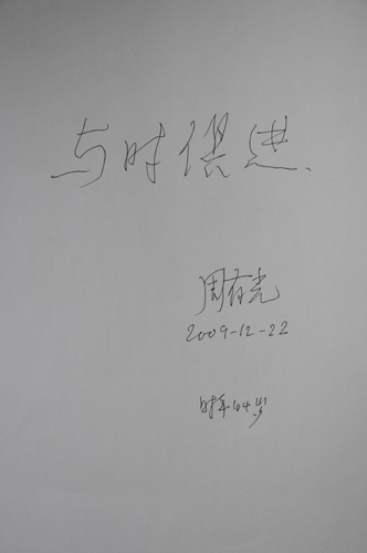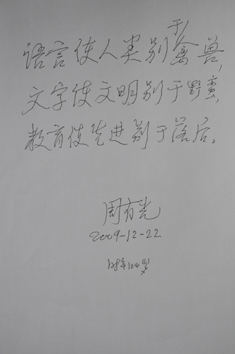 周有光先生向冯克坚同志表示感谢,并说明自己历来“不祝寿、不过年、不过节”。他还为中国文字博物馆题写了“语言使人类别于禽兽、文字使文明别于野蛮,教育使先进别于落后”,并希望中国文字博物馆能与中国文字的发展“与时俱进”。