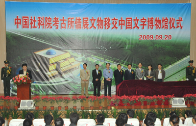 安阳市文化局局长、中国文字博物馆党委副书记王金涛主持借展文物移交仪式。齐肇业在讲话中表示中国文字博物馆建设是我国文化事业和博物馆建设上的一件大事,中国社会科学院能够为此伟大工程贡献自己的力量感到十分光荣,同时,也将继续关注和支持中国文字博物馆建设。