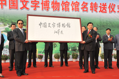馆名转送仪式在中国文字博物馆广场举行,仪式由孔玉芳主持。徐光春代表省委、省政府将江泽民同志题写的中国文字博物馆馆名郑重转送给安阳市委书记张广智。江泽民同志题写的“中国文字博物馆”古朴遒劲,与中国文字博物馆庄重厚重的文化内涵相映生辉。此次转赠再次体现了党中央、国务院、河南省委、省政府对中国文字博物馆建设的高度重视、大力支持及殷切期望,极大地鼓舞了中国文字博物馆建设者们。
