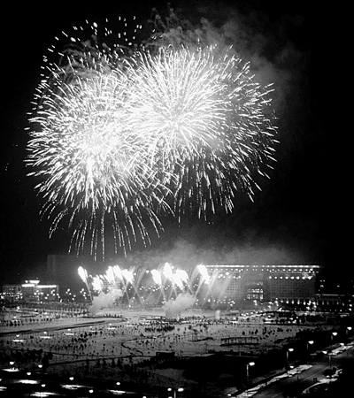 11月16日下午,中国文字博物馆震撼开馆。当晚8时,我市在党政综合楼南广场和市廉租房建设工地(安阳西客站西南侧)同时举行中国文字博物馆开馆庆典暨2009中国·安阳殷商文化旅游节闭幕式——“相约文字之都”焰火晚会。璀璨焰火的映衬下,文字之都——安阳到处洋溢着欢乐祥和的节日气氛。