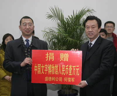 中国文字博物馆建设领导小组专职副组长冯克坚代表中国文字博物馆接受盛德利公司捐款。