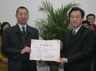 中国文字博物馆建设领导小组专职副组长冯克坚为盛德利公司颁发捐赠证书。