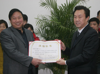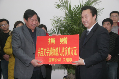 中国文字博物馆建设领导小组专职副组长冯克坚代表中国文字博物馆接受国泰房地产开发有限公司捐款。