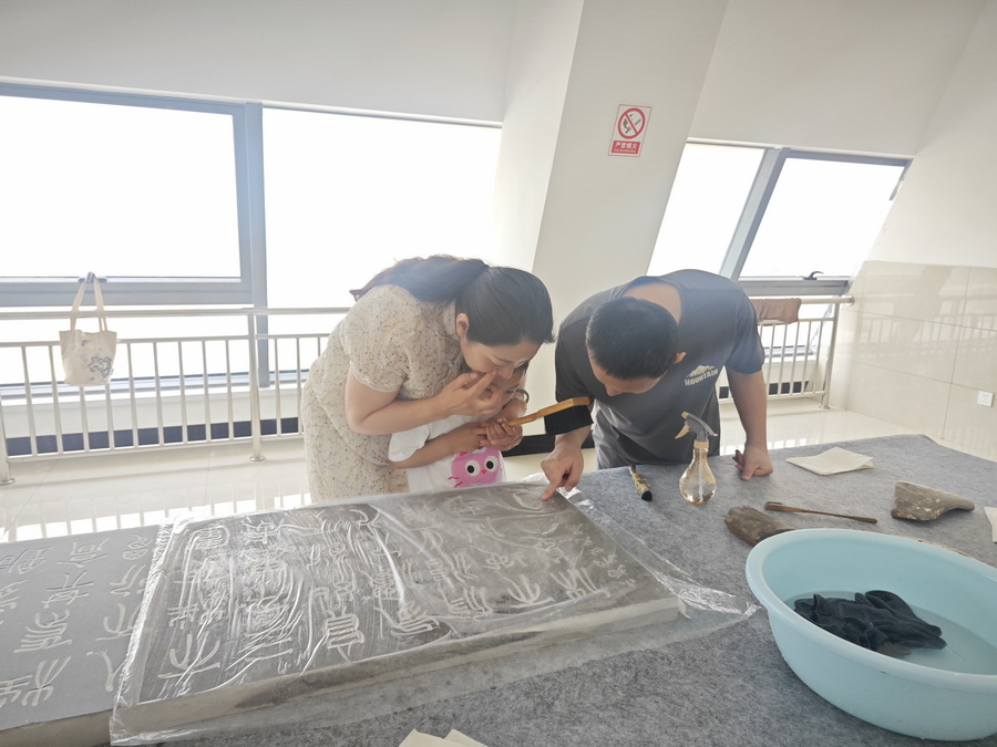 参与者们专心致志:喷湿宣纸、轻刷入纹、拓包匀墨……当石碑上的文字渐渐显形,欢呼声此起彼伏,现场气氛热烈,大家互相交流拓印经验,分享心得体会。