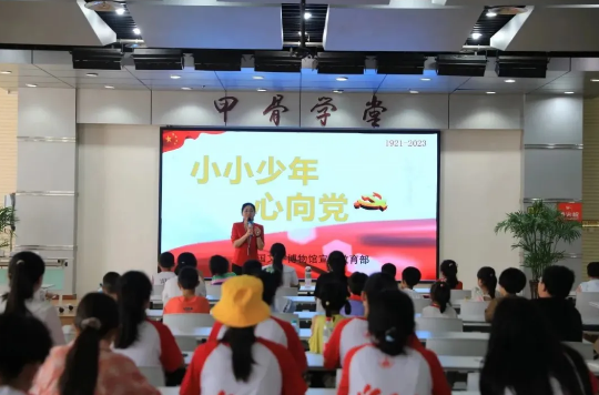 2023年7月1日上午,在中国文字博物馆甲骨学堂,30组家庭近70人参加了“小小少年心向党”七一主题教育活动,共同庆祝中国共产党成立102周年。