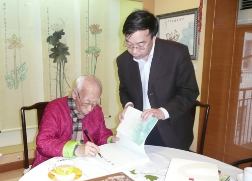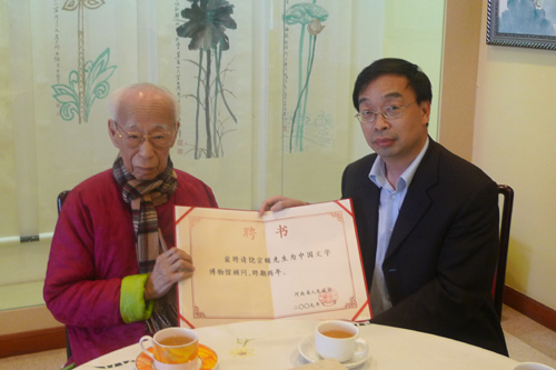 李宽生向饶宗颐先生转送中国文字博物馆顾问聘书