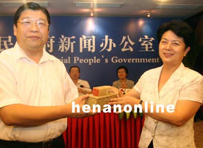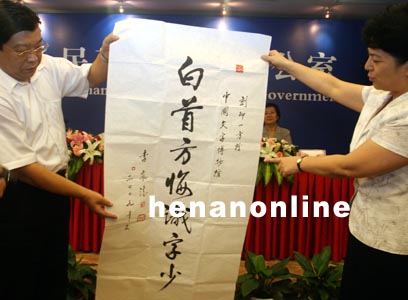 省委常委、宣传部长、副省长孔玉芳在新闻发布会上向安阳市委书记张广智转赠石章、条幅、亲笔信(一)。