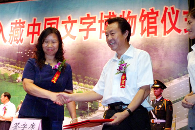 省长助理卢大伟主持文物入藏仪式。张柏、孔玉芳共同为入藏文物揭幕。郑州、开封等12个省辖市文博单位分别与中国文字博物馆签订文物入藏协议。张柏在文物入藏仪式上说,中国文字博物馆是国家重点文化工程,受到了党中央和国务院的高度重视。自文物征集工作启动起来,河南省加大省内文物征集力度,取得了显著成绩。此次文物入藏仪式的举行,标志着中国文字博物馆建设取得了又一个阶段性成果,也体现了河南省党委、政府高度的政治意识和有关部门、各地文博单位的大局意识、责任意识,更表达了河南省人民齐心协力建设好中国文字博物馆的信心和决心。让我们鼓足干劲,共同为中国文字博物馆年底震撼开馆而努力。