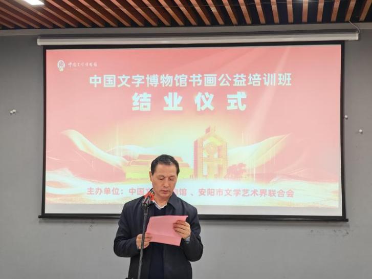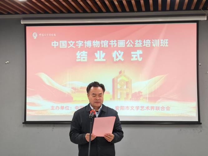 宁红亮在结业仪式上致辞。他首先向辛勤付出的导师表示感谢,向顺利结业的学员表示祝贺。他强调,书画艺术是中华优秀传统文化的璀璨明珠,承载着中华民族的审美理想与精神追求,凝聚着千年以来中华民族的智慧与情感。此次书画公益培训班,为广大书画爱好者搭建了一个学习交流、提升技艺的优质平台。他表示,中国文字博物馆将继续坚守传承中华文明、弘扬汉字文化的使命,持续发挥自身资源优势,推出更多更好的学习交流平台,不负大家的信任与期待,助力书画艺术的传承和发展。